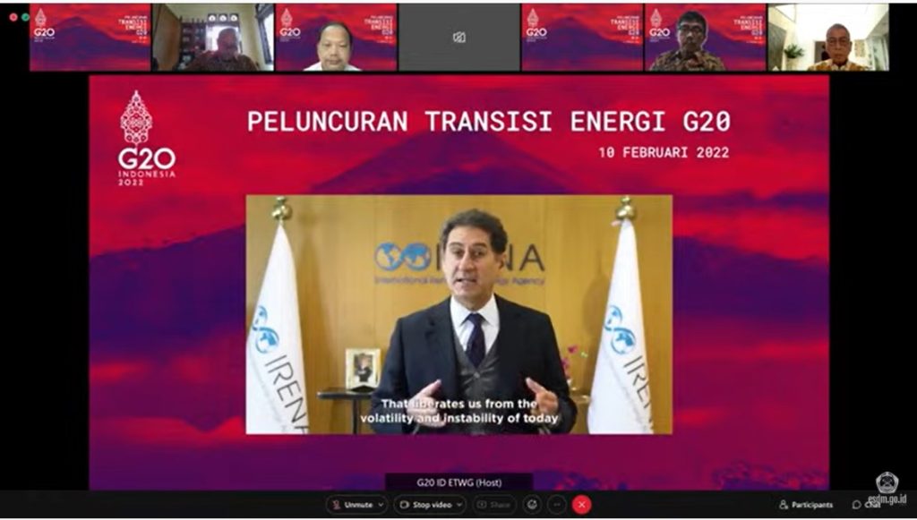 Dukungan lain juga diberikan oleh Internasional Renewable Energy Agency (IRENA). “Saya senang transisi energi diidentifikasikan sebagai isu prirotas pada Presidensi G20 Indonesia. Melalui forum ini, Indonesia memiliki kesempatan tidak hanya untuk mendorong momentum politik tetapi juga menunjukkan kepemimpinan transisi energi melalui aksi. Saya menyambut baik komitmen Indonesia untuk mencapai net zero emission pada tahun 2060 atau lebih cepat,” jelas Director General IRENA Francesco La Camera.