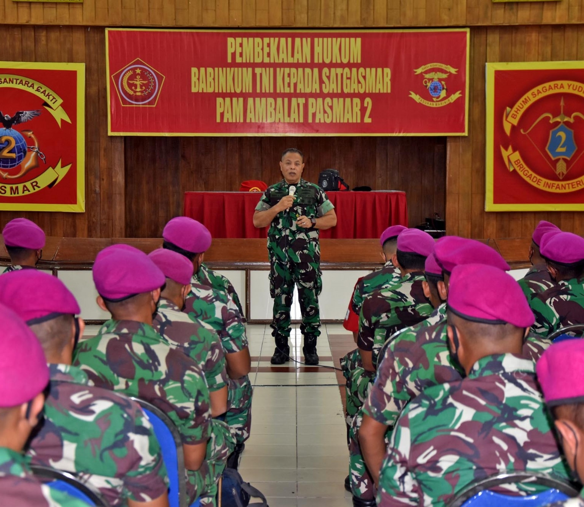 Dalam rangka menindaklanjuti Perintah Harian Kepala Staf Angkatan Laut (Kasal) Laksamana TNI Yudo Margono tentang pembangunan Sumber Daya Manusia unggul dan profesional serta tangguh dalam menghadapi segala ancaman, prajurit Pasmar 2 Korps Marinir yang tergabung dalam Satgasmar Pam Ambalat XXVIII menerima pembekalan Hukum Humaniter di Gedung Ediarto Bapra Kesatrian Marinir R. Suhadi Brigif 2 Marinir Gedangan, Sidoarjo, Jawa Timur, Selasa (29/03/2022).
