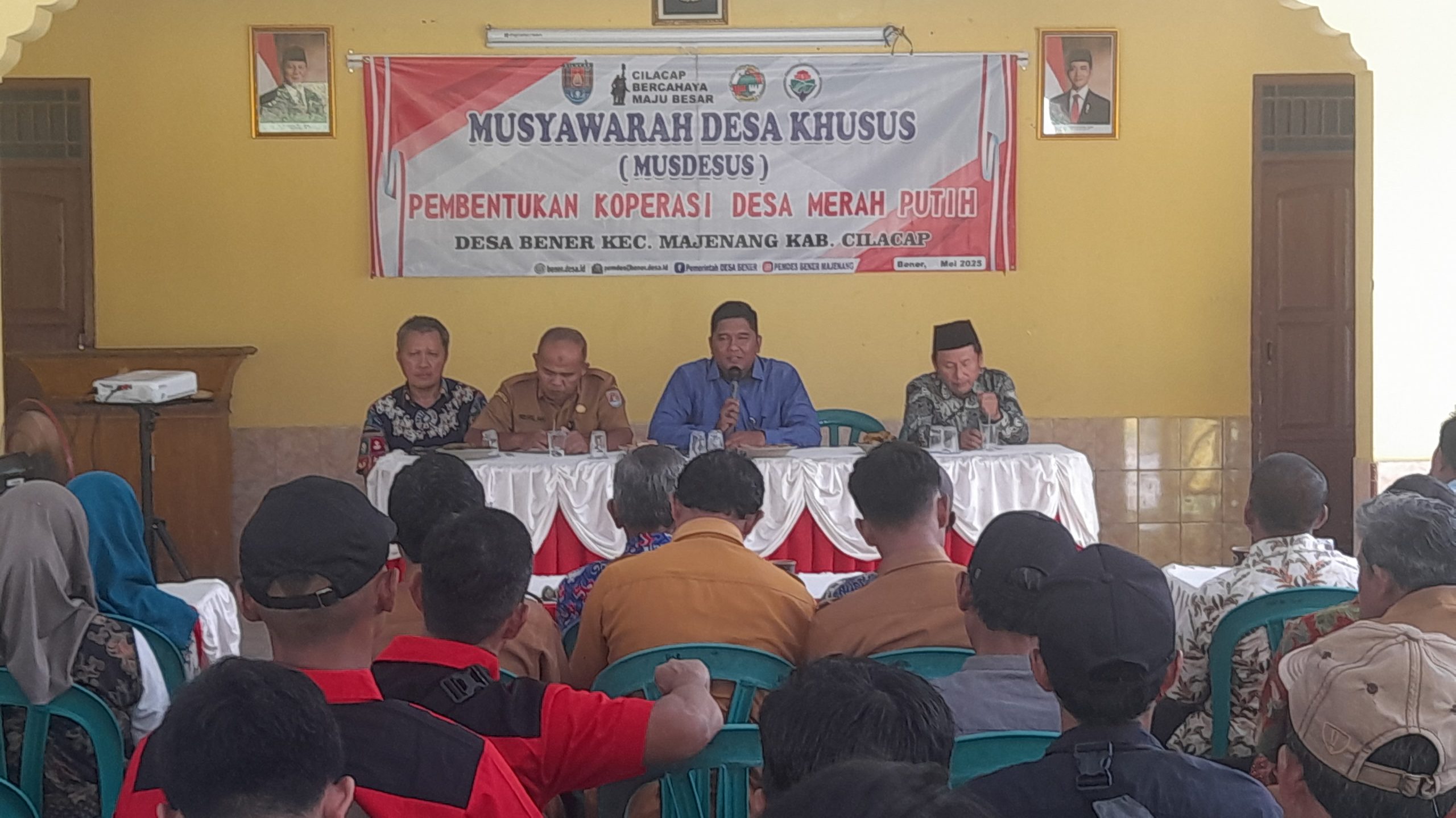 Cilacap, “Pemerintah Kabupaten Cilacap Gerak Cepat menindaklanjuti Surat Edaran Kemendagri terkait percepatan pembentukan Koperasi Desa Merah Putih “. Hal ini disampaikan Camat Majenang Aji Pramono ketika menghadiri pelaksanakan musyawarah desa khusus (musdesus) pembentukan Koperasi Merah Putih Desa Bener Kecamatan Majenang Kabupaten Cilacap ” Hari Selasa tanggal 20 Mei 2025